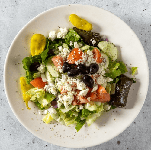 Lettuce tomato, onions, cucumbers, feta cheese stuffed grape leaves, kalamata olives and oregano topped with homemade house dressing.