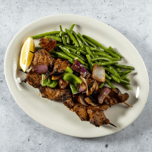 Specially marinated cubes of pork char grilled on a skewer. All entree include either potato vegetable, soup or salad.
