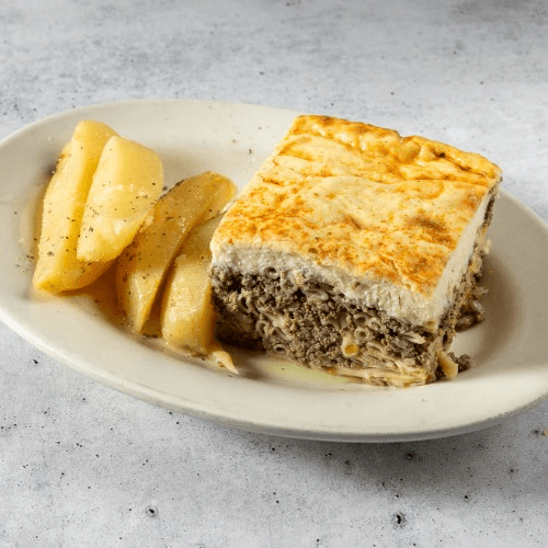 Layers of eggplant, ground beef and potatoes topped with bechamel sauce. All entree include either potato, vegetable, soup or salad.
